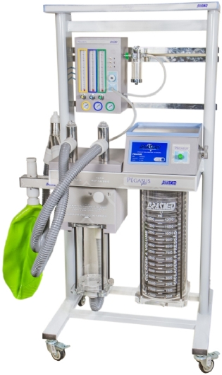 VENTILADOR PARA ANESTESIA DIGITAL MICROPROCESSADO, com tela de LCD Touch Screen 7 polegadas, Indicando funções ventilatórias VCV e PCV.