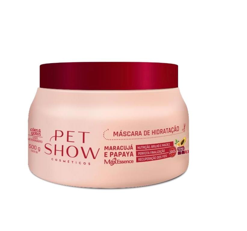 água e aplique a Máscara de Hidratação Max Essence Maracujá e Papaya da Pet Show na pelagem úmida. Coloque