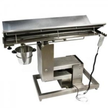 Mesa pantográfica calha totalmente em aço inox, com dois motores, com chapa reforçada para não assustar o animal, com vincos e furo para escoamento de líquidos, acabamento interno sem deformação de chapa. Motores hospitalares blindados que facilitam a limpeza da mesa. Altura mínima 700mm, e altura máxima 1100.