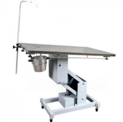 Tampo e chapa em aço inox reforçada para não assustar o animal, com vincos e furo para escoamento de líquidos acabamento interno sem deformação da chapa e manopla para inclinação lateral. Base para regulagem de altura automática, esmaltada na cor branca. Acompanha suporte de soro em aço inox e balde de alumínio. Motores hospitalares blindados.