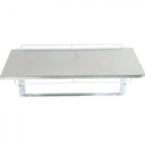 Mesa de parede, com tampo em aço inoxidável, com cantoneira e base em aço inox para amarras. Acompanha suporte de soro.